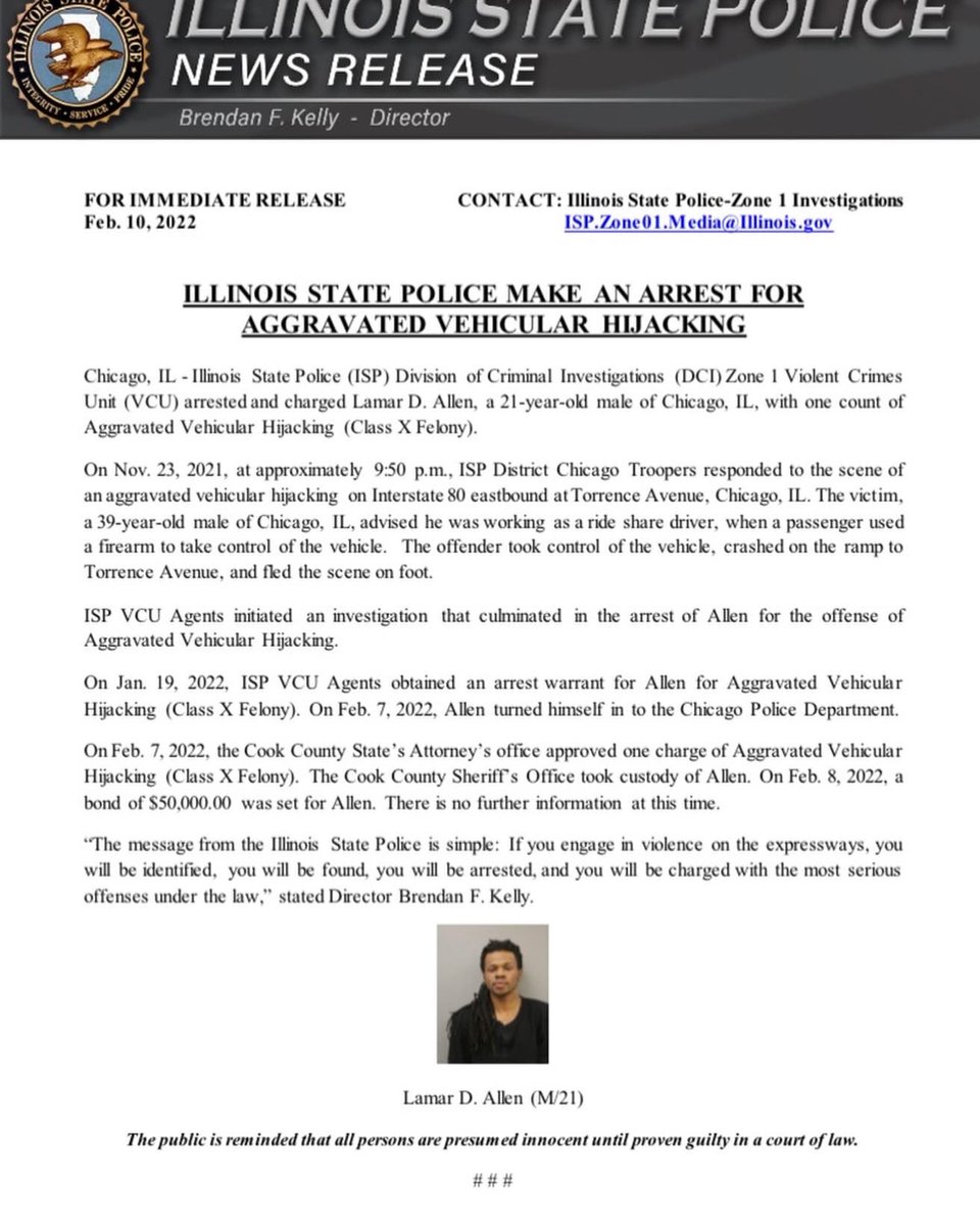 Illinoisstatepolice On Twitter Illinois State Police Make An Arrest For Aggravated Vehicular Hijacking Https T Co Vyeexr5wlm Twitter